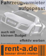 Den deutlichen Trend zur Online Mietwagen Buchung unterstützend, ermöglicht -die Informationsplattform für Fahrzeugvermietung- www.rent-a.de auch kleineren lokalen Autovermietungen mit geringen Budgets effektiv im Internet zu werben. Jeder Fahrzeugvermieter ist in einer Fahrzeugkategorie kostenlos gelistet. Weitere Platzierung nach der Formel: Kategorien x Standort x Domain x 12 Monate = Betrag in EUR/Jahr. Autovermieter die sich gut im Internet positionieren haben mehr Zeit für „wertschöpfende“ Serviceleistungen in der Mietwagenstation.