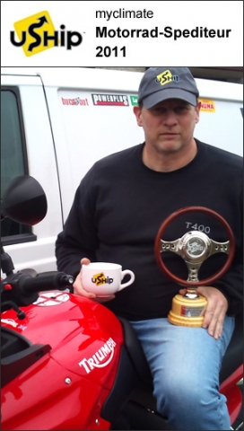 Der Preis für den Besten uShip-myclimate Motorrad Spediteur 2011 geht an motobiketransport. 175 positive Bewertungen, eine 100% positive Bewertungsrate und eine glatte 5,0 in der Bewertungskategorie "Behandlung der Güter" sprachen für das uShip-myclimate Komitee eine eindeutige Sprache. Auch machte die Aussage von Thorsten Kleber, den Inhaber von motobiketransport, Eindruck, dass Kunden regelmäßig von seinem Service so zufrieden seien, dass Sie ihn nach der Anlieferung des Motorrads zu Kaffee und Kuchen einladen. "Dabei vergesse ich allerdings nie meinen Terminplan, da andere Kunden natürlich nicht warten dürfen. Einladungen zu einem Glas Wein schlage ich dagegen grundsätzlich aus. Ab und zu wird mir dann eine Flasche Wein geschenkt. Von dieser gönne ich mir nach getaner Arbeit gerne ein Gläschen."