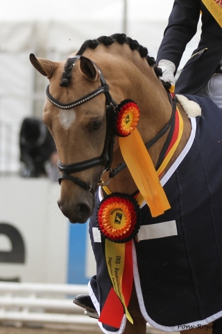 (firmenpresse) - Jeder Start ein Sieg, das ist die einzigartige Bilanz der Saison 2011 für Caramel FH. Präsentiert durch Andrea Müller-Kersten, holte er bei sieben Starts sieben goldene Schleifen. Als überlegener Bundeschampion begeisterte der typvolle Falbe wie kaum ein anderes Pony in den letzten Jahren und ließ mit Höchstnoten seine starke Konkurrenz hinter sich. Der einstige Körungssieger brillierte in allen Grundgangarten und überzeugte durch unschlagbare Rittigkeitswerte, die von Richtern, Fremdreitern und Zuschauern erkannt und bejubelt wurden. Im besten Sinne "titelträchtig" ist auch seine Verwandtschaft: Der Vater Cyriac WE war selbst Seriensieger in Reitpferdeprüfungen und holte sich 2005 unter Andrea Müller-Kersten in einem "Start-Ziel-Sieg" den Titel des Bundeschampions des Deutschen Reitponys. Die Mutter Goldene Deern hat selbst Reitpferdeprüfungen gewonnen, war hochplatziert beim Landeschampionat in Rastede und Vierte im Bundeschampionat 2002 in Warendorf. Die Großmutter Golden Felina stellte in dem Top-Vererber Pilgrim"s Red (v. Principal Boy; Bundeschampion 1999) und dessen jüngerem Vollbruder Prinz Farbenfroh zwei gekörte Söhne. Ihre Tochter Golden Graciella WE war 2011 Vize-Bundeschampionesse des Deutschen Reitponys. Mit Black Boy, Valentino und Caid AA folgen epochal prägende Vererber der Reitponyzucht in Weser Ems wie Perlen an einer Schnur in den folgenden Generationen.