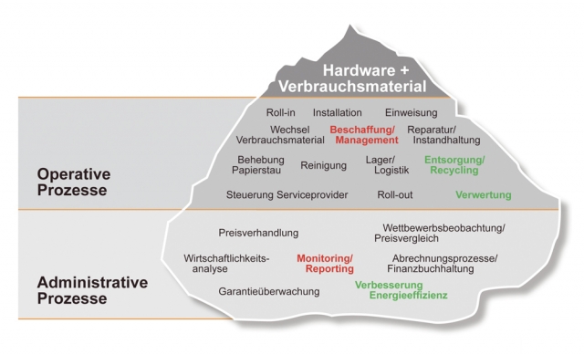 Das Konzept setzt auf volle Kosten-Nutzentransparenz und kontinuierlichen Informationsaustausch zwischen Kunden-IT und Händler während der Vertragslaufzeit. Dazu tragen auch die Reports bei, die zu definierten Zeitpunkten automatisch an vorab bestimmte Empfänger verschickt werden. Ziel ist es, auf Basis regelmäßiger Auswertungen nicht nur direkte Kosten wie Anschaffung und Verbrauchsmaterial zu senken sondern vor allem indirekte Kosten aufzudecken wie Installation, Wartung, Monitoring, Garantieüberwachung, Behebung von Fehlermeldungen und Entsorgung, und diese nachweislich zu reduzieren. Kosten- und Zeitersparnis werden als Projektziele definiert, die Händler und Kunde gemeinsam erreichen können.