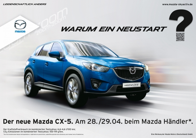Der Mazda CX-5 ist das erste Modell, mit dem Mazda dank SKYACTIV Technologie sein Unternehmensziel verwirklichen konnte, Fahrvergnügen und Effizienz optimal miteinander zu vereinen. Mazda startet in eine neue Zukunft, die viele interessante -vor allem technische - Fragen aufwirft. Alles ständig zu hinterfragen, mit Hingabe anders sein, diese Philosophie liegt der Marke zugrunde und bildet die Kernidee des werblichen Auftritts für die Einführungskampagne des Mazda CX-5 in Deutschland. Dieser basiert auf der europaweiten Dachmarkenkampagne, die für den deutschen Markt "Leidenschaftlich anders" betitel ist. Die daraus resultierende Interpretation für Mazdas neuesten SUV findet Ausdruck im dem Claim "Warum ein Neustart"? Beantwortet wird dies in einer crossmedialen Kampagne in den Kanälen TV, Online, Funk, Print, Out of Home und am POS. Zentraler Bestandteil ist die Mazda Online-Plattform sowie aufmerksamkeitsstarke QR-Codes. Ab Mitte April werden dann auch über 5.000 Plakat-Großflächen bundesweit angemietet und 30-Sekunden-TV-Spots laufen parallel an um die geplante Mazda PremierenParty zur offiziellen Markteinführung des Mazda CX-5 am 28. und 29. April anzukündigen.