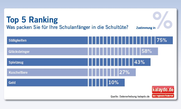 (firmenpresse) - Köln, 15. August 2012. Bei vielen Kindern wird die Aufregung immer größer: In Kürze gehen sie zum ersten Mal in die Schule. Und auch für die Eltern ist der Schulstart etwas Besonderes. Kein Wunder, dass aus diesem feierlichen Anlass die Schultüte so richtig vollgepackt wird. Denn laut der Umfrage "Was kaufen Sie für Ihre i-Dötzchen" des Kleinanzeigenportals kalaydo.de bekommen die Schulanfänger nicht nur Ranzen, Mäppchen & Co. Zur schulischen Grundausstattung kauft die Mehrzahl der 500 Befragten jeweils noch verschiedene Sportutensilien, Kleidung, Lernspiele und Bücher sowie Süßigkeiten, Spielzeug und Glücksbringer - und natürlich eine Schultüte. Insgesamt geben Zweidrittel der Eltern bis 200 Euro für die ABC-Schützlinge aus.