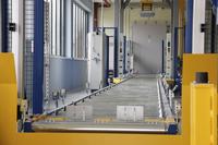 Die von der Sterilisation kommenden Fertigwarenpaletten werden automatisch gewickelt und auf Übergewicht kontrolliert. Ein Verteilwagen übernimmt die Verteilung der Paletten auf die einzelnen Lagergassen.