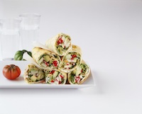 2. Die Avocado schälen, halbieren, den Kern entfernen und der Länge nach in Streifen schneiden. Die Radieschen waschen, putzen und in Stifte schneiden. Den Kohlrabi schälen und dicke Stifte schneiden. Die Salatblätter waschen und trocken schleudern. Für die Füllung die Crème fraîche mit der Zitronenschale, Salz und Pfeffer verrühren und auf die Crêpes streichen, jeweils mit Salatblättern und dem Gemüse belegen, salzen, pfeffern und einrollen. Die Rollen jeweils in zwei Hälften schneiden und sofort servieren.