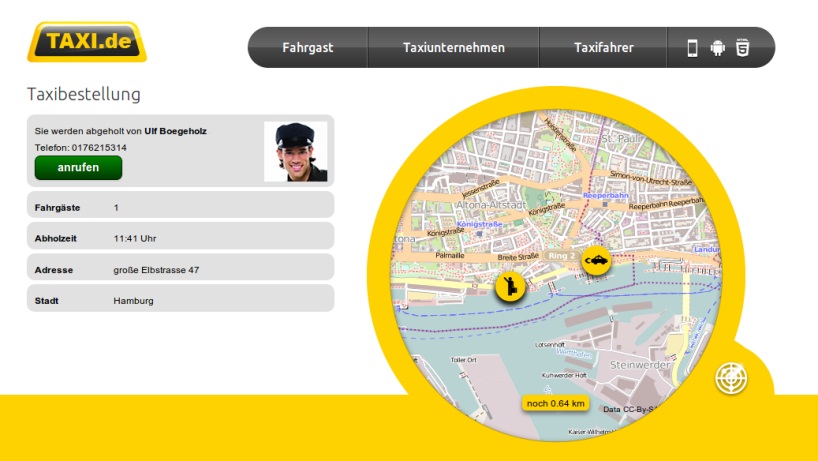 (firmenpresse) - Es ist keine Seltenheit, dass in Hotels und Restaurants ein Taxi für den wartenden Gast bestellt wird. Trotzdem gestaltet sich dies oft schwierig. Selten kann eine exakte Angabe gemacht werden, wann das Taxi vorfahren wird und der Mitarbeiter, der das Taxi bestellt, kann sich nicht weiter um den Gast kümmern, während er am Telefon ist. Hinzu kommt, dass bei Hochbetrieb oft die Zeit fehlt. Mit der neuen Bestellmaske von Taxi.de wird dieser Vorgang deutlich beschleunigt. Der Bestellvorgang nimmt nun nur wenige Sekunden in Anspruch, da nur noch die Anzahl der Fahrgäste eingegeben werden muss. Der Mitarbeiter kann dann auf einer Karte die Anfahrt des Taxis verfolgen und so dem Gast eine genaue Einschätzung über die erwartete Ankunftszeit geben. Auch Vorbestellungen sind möglich.