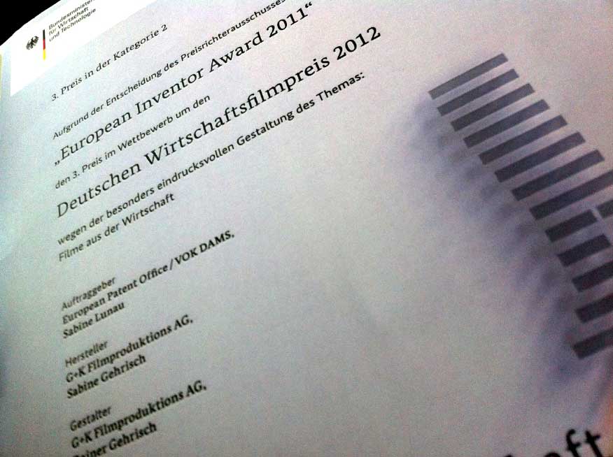 G+K Filmproduktion aus Frankfurt am Main gewinnt Bronze beim Deutschen Wirtschaftsfilmpreis 2011 für den Beitrag EUROPEAN INVENTOR AWARD 2011