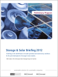 (firmenpresse) - (NL/7045268457) Am 10. Oktober fand das diesjährige »Storage und Solar Briefing 2012« in Stuttgart statt, zu dem die EuPD Research eingeladen hatte. Die englischsprachige Veranstaltung gab einen umfassenden Einblick in den aktuellen Stand der Technik bei den Speichertechnologien in Verbindung mit Solarenergie und zeigte entsprechende Zukunftsszenarien auf. Anwesend waren sowohl die klassischen Solarunternehmen, als auch Stromversorger, Vertreter von Behörden und Forschungseinrichtungen.