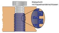 Verschiedenste Anwendungen erfordern unterschiedliche Arten der Freisetzung der Materialien. Je nach Einsatzgebiet sollen die Kapseln am Einsatzort durch mechanische Arbeit, Auflösung des Wandmaterials oder auch gar nicht zerstört werden. Bei mikroverkapselten Klebstoffen befindet sich die reaktive Komponente im Material eingeschlossen, in einer Glas- oder Polymerhülle. Als chemische Basis kommen unter anderem: Polyester, Epoxydharze, Acrylate und Polyurethane in Frage. Vor dem Materialauftrag, während des Förderns und Dosierens, gilt es unbedingt zu vermeiden dass die Kapseln zerstört werden. Die Ingenieure der Firma ViscoTec haben sich intensiv mit der Problematik befasst und Entnahmesysteme für fast alle am Markt befindlichen Gebinde (Fass, Hobbock, Dose, Kartusche, freier Zulauf, etc.) entwickelt um eine schonende Förderung zu den Dispensern gewährleisten zu können. Solche Dispenser werden beispielsweise bei der Beschichtung von Schraubengewinden mit selbst aushärtender Schraubensicherung erfolgreich eingesetzt (Abbidlung 1). Hier sollen die Mikrokapseln erst durch die Scherkräfte beim Eindrehen der Schrauben in das Gewinde aufbrechen und somit eine Klebe- und Dichtwirkung erzielen.