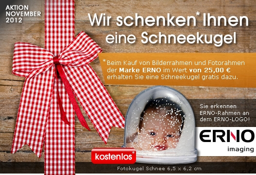 Als zweite Aktion wird jeder Bestellung von Qualitätsbilderrahmen und -fotorahmen der Marke ERNO ab 25 Euro Warenwert eine Schneekugel gratis beigelegt. Der Traditionsbetrieb ERNO Photo GmbH ist das führende Unternehmen von hochwertigen Bilderrahmen, Fotorahmen und Fotoalben, das in seiner Sortimentszusammenstellung immer den Zahn der Zeit trifft. Auf bilderrahmen-kaufen.de kann aus über 600 verschiedenen Produkten aus der Kollektion der Marke ERNO gewählt werden. Dabei hält der Onlineshop für jedes Kunstwerk, Erinnerungsfoto und jeden Anlass tolle Bilderrahmen, Fotorahmen und ungewöhnliche Geschenkideen zur Präsentation von Fotografien aus verschiedenen Materialien von ERNO bereit. Für das leichtere Erkennen der Markenprodukte von ERNO ist jedes Produktangebot mit dem ERNO-Logo versehen. Also, nichts wie auf und im November 2012 eine gratis Schneekugel mit jedem Kauf von ERNO-Produkten abstauben.