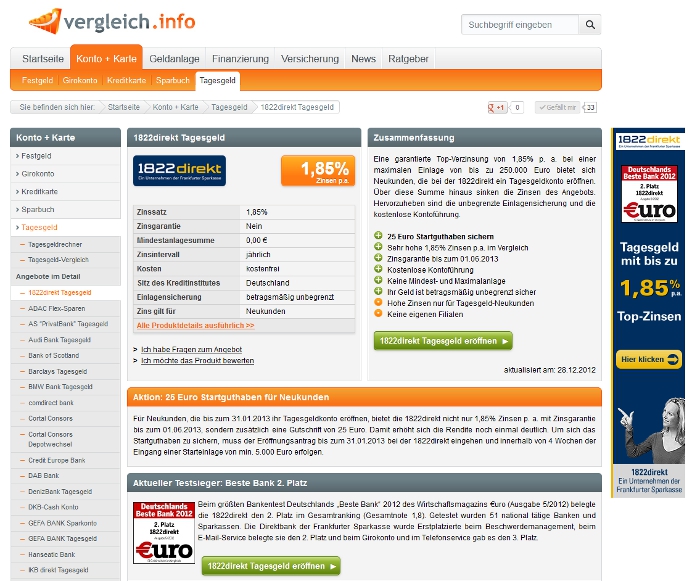 Vergleich.info informiert: 25 Euro Startguthaben für Neukunden des 1822direkt Tagesgeldkontos Plus: 1,85 % Zinsen p. a. garantiert bis 1. Juni 2013