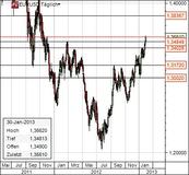Der Bruch des wichtigen Widerstands bei 1,34 scheint für Euro-Dollar eine Weichenstellung gewesen zu sein: Anschlusskäufer bzw. ausgestoppte Short-Positionen katapultieren die Gemeinschaftswährung weiter in Richtung 1,36 nach oben. Klar: die Eurokrise ist immer noch der Fall (vor allem Spanien), aber die Wahrnehmung hat sich verschoben. Auf der Suche nach fundamentalen Gründen der Euro-Stärke (nicht nur gegenüber dem Dollar) finden wir eigentlich nur ein einziges, aber gleichwohl gewichtiges Argument: die Bilanz der EZB verkleinert sich derzeit - Käufe von Staatsanleihen etwa Spaniens werden nur "angedroht" aber faktisch nicht getätigt, während die anderen großen Notenbanken seit langem massiv die Anleihen ihrer Länder kaufen (Fed, Bank of Japan, Bank of England etc.).