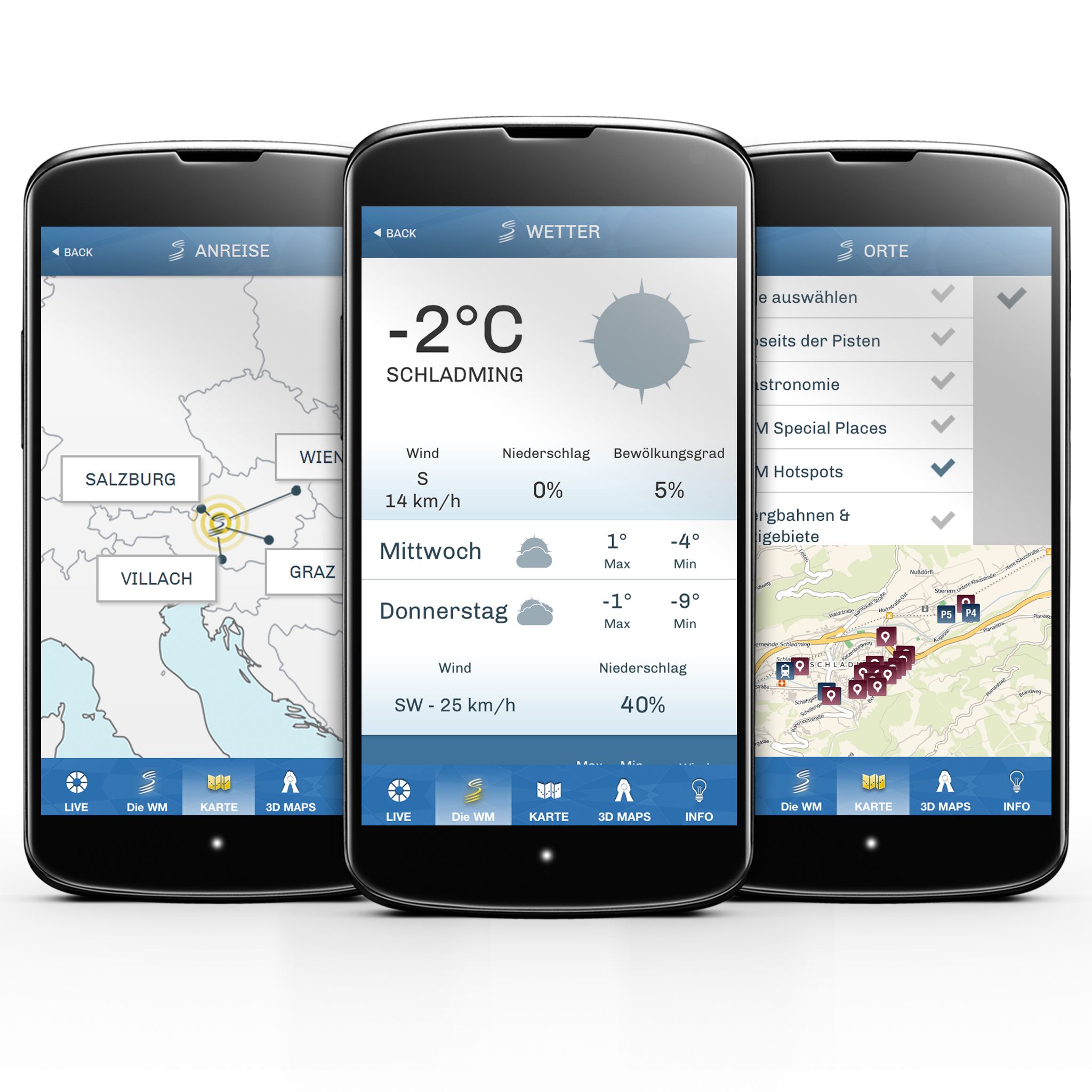 (firmenpresse) - Neben Anreiseguide und aktuellen Verkehrsmeldungen können WM-Begeisterte auch via LiveScreen und LiveTicker jedes Rennen hautnah verfolgen. Darüber hinaus werden News, Termine, Bildergalerien und Videos rund um die WM und ihren Stars bereitgestellt, aber auch Informationen zu Events, Restaurants oder anderen touristischen Highlights können einfach und bequem via Smartphone abgerufen werden. Ein neuer Maß-stab wurde mit der Integration der virtuellen 3-D-Welt von Schladming gesetzt! Live und per GEO-Verortung steht den Besuchern eine völlig neue Perspektive der Veranstaltungsregion zur Verfügung.