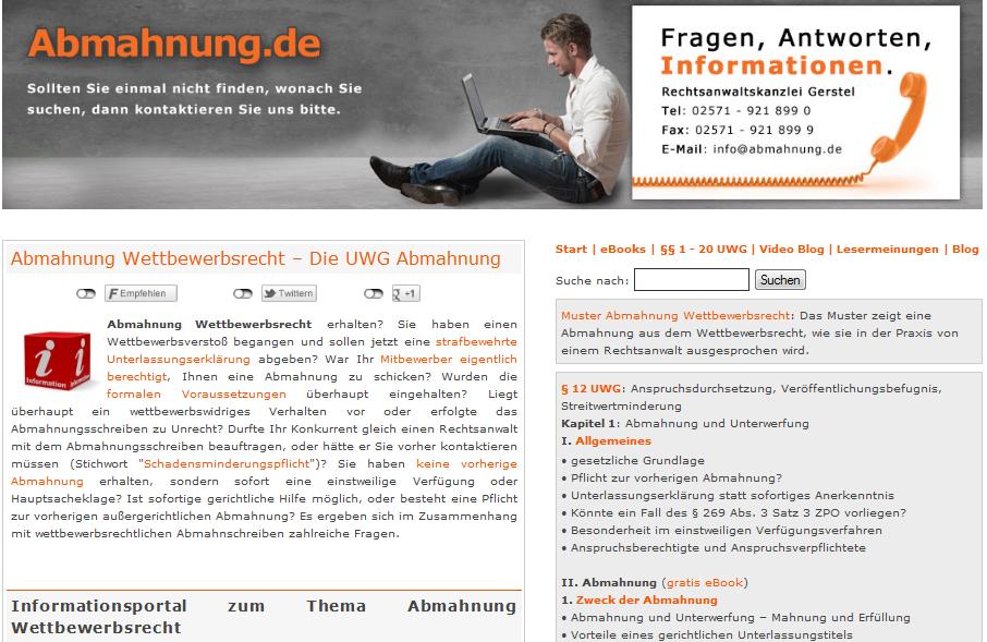 Die gesamte Website dient zur Information über Abmahnung Wettbewerbsrecht. Das Informationsangebot ist praxisnah und dient als Hilfe und Information bei einer Abmahnung. Andreas Gerstel versucht so Begriffe wie Wettbewerbsverstoß oder Unterlassungserklärung zu erläutern. Fragen zur Abmahnung, zum dazugehörigen Abmahnungsschreiben, zur einstweiligen Verfügung und zum Gesetz gegen den unlauteren Wettbewerb (UWG) werden vom Fachanwalt geklärt. Das Portal bietet Aufklärung zum UWG und Hilfe bei der Anwendung im Praxisfall.