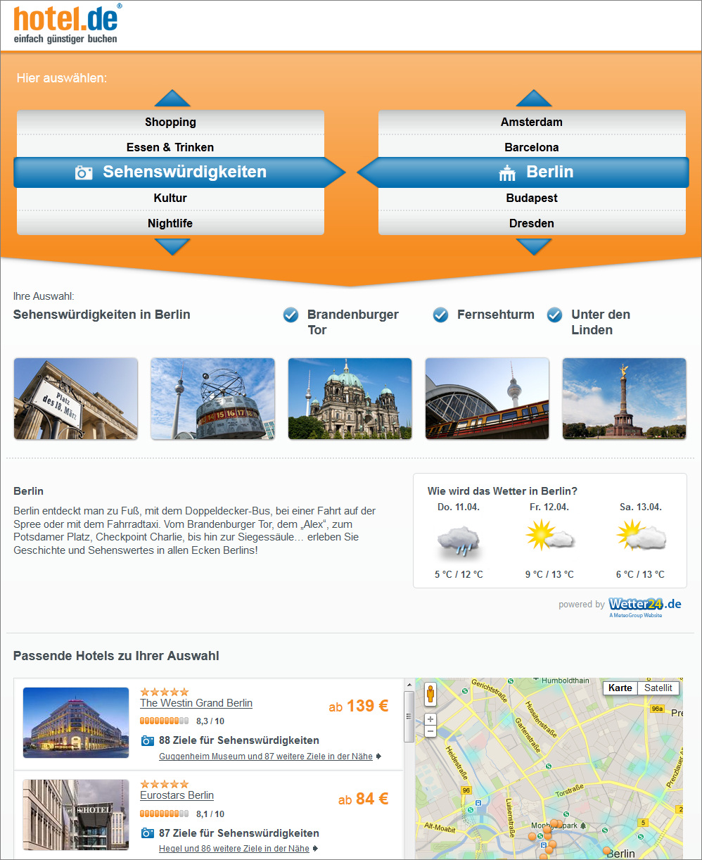 Über zwei Trommeln kann der Buchungskunde auf der einen Seite die gewünschte Aktivität und auf der anderen Seite die Destination auswählen. Dadurch erhält der Kunde eine passende Hotelauswahl in der Nähe zur eingestellten Auswahl. Klickt man nun auf das Hotel, dann zeigt die Explorative Suche (in diesem Fall Sehenswürdigkeiten Berlin, http://www.hotel.de/de/berlin-sehenswuerdigkeiten/explorativesearch-1-2) alle im Umkreis des Hotels befindlichen Sehenswürdigkeiten an. Um sich bestens zu orientieren, sind die Hot Spots verlinkt und beim Darüberfahren mit der Maus erscheinen die Namen der Lokalitäten. Insgesamt wurden über 172.000 Informationen zu Clubs, Bars, Restaurants, Shoppingmöglichkeiten, Kultureinrichtungen und Sehenswürdigkeiten in die Explorative Suche integriert. Somit können die eigenen Bedürfnisse für einen Städtetrip optimal identifiziert, abgedeckt und die dazu passende Hotelauswahl getroffen werden.