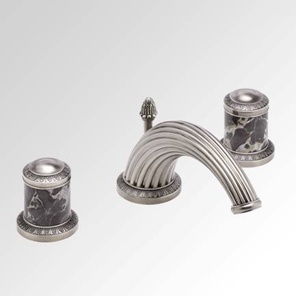 Für anspruchsvolle Liebhaber einer mondänen, zeitlosen Atmosphäre fertigten die Handwerker von THG Paris eine formvollendete, schmuckstückgleiche Badezimmerarmatur. Der für den Empire-Stil typische Palmettenrand aus kleinen Palmwipfeln verziert den schwungvoll kannelierten Auslauf mit vergoldeter oder patinierter Nickeloberfläche und Knäufe aus schwarzem Portoro oder Kristall. Perfekt gearbeitete Accessoires wie Handtuchhalter und Seifenschalen vervollständigen die Kollektion.
