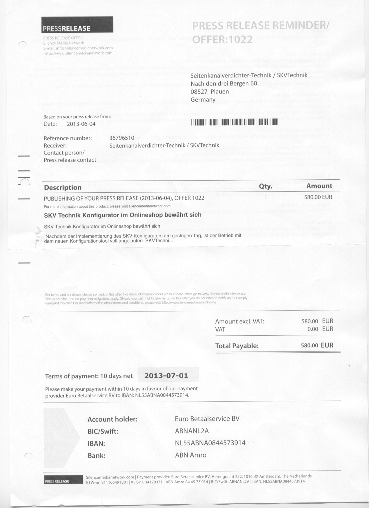 (firmenpresse) - (NL/2832328830) SKVTechnik nimmt heute Stellung zu FAKE-Rechnungen von Silence Media Network, die derzeit die Runde bei denjenigen Werbetreibenden macht, die bei Onlineorganen Pressetexte veröffentlichen. Kunden erhalten Angebote die im Stile einer Rechnung daherkommen. Derzeit erhalten viele Werbetreibende vermeintliche Rechnungen der Firma Silence Media Network über 580 EURO für den Versand einer Pressemitteilung.