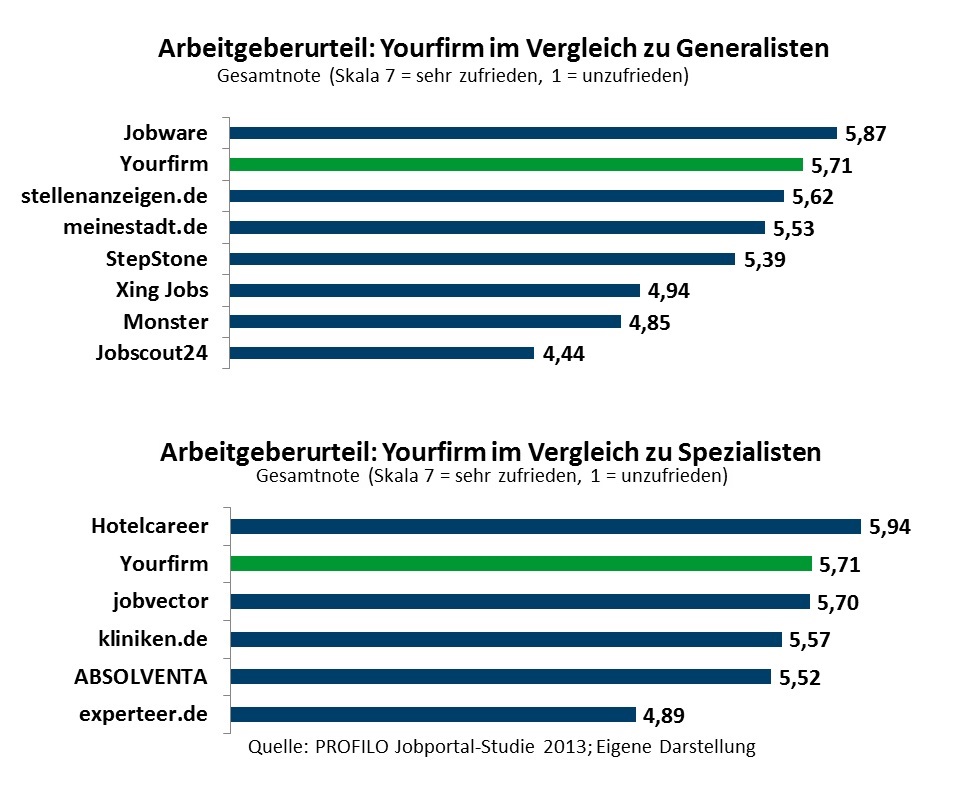 Mit 5,71 von insgesamt 7 möglichen Punkten ergatterte sich Yourfirm den zweiten Platz unter den Spezialisten. Dabei muss sich das Portal im Vergleich zu den Generalisten keineswegs verstecken: Auch in der Gesamtwertung ist Yourfirm unter den Top 3 zu finden und hängt damit beispielsweise Wettbewerber wie Stepstone, Monster oder Jobscout24 ab.