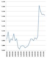 Und nun werfen wir mal einen Blick, was innerhalb weniger Minuten – von der Veröffentlichung über Lesen bis hin zum Interpretieren und dementsprechend Handeln – passiert ist. Um 14:39:51 h erreicht der DAX seinen Tageshöchststand von 5.162,12 Punkten. Keine 10 Minuten für 1,25% Kurswachstum. Alle wesentlichen Indizes folgten diesem Verlauf. Das ist Globalisierung auf Börsianisch.