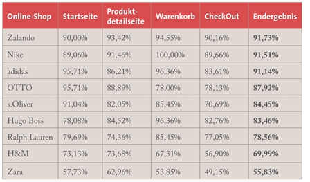 Zu interessanten Ergebnissen ist QUISMA bei der Untersuchung der Startseiten gekommen: Obwohl Zalando und Nike im Gesamtergebnis führen, hatten sie hier aus allen Leistungsbereichen das schwächste Ergebnis. Im Gegensatz dazu haben fünf der Online-Shops hier ihr bestes oder zweitbestes Ergebnis.
