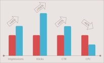 Ergebnis: Durch die Umstellung auf das neue System und die dadurch möglichen Optimierungen konnten die Einblendungen um 44 Prozent gesteigert und die Klicks mehr als verdoppelt werden. Die Klickrate verzeichnete durch die verbesserte Reichweite einen Anstieg von 43 Prozent und die Klickkosten konnten auf knapp die Hälfte reduziert werden.