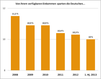 „Eine zentrale Ursache für den Rückgang der Sparquote ist die lockere Geldpolitik der Europäischen Zentralbank (EZB). Die niedrigen Zinsen verringern die Erträge konventioneller Zukunftsvorsorgeprodukte und damit auch die Sparanreize“, analysiert Dr. Andreas Martin, Vorstandsmitglied des Bundesverbandes der Deutschen Volksbanken und Raiffeisenbanken (BVR) das Verhalten der deutschen Sparer (PM BVR vom 8.10.2013).