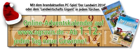Für die vorweihnachtliche Stimmung und 24 Tage Spannung sorgt die AGRAVIS Raiffeisen AG auch in diesem Jahr wieder mit dem virtuellen Adventskalender. Vom 1. bis 24. Dezember können die Nutzer der Konzern-Website unter http://www.agravis.de/adventskalender jeden Tag ein Türchen des Adventskalenders öffnen und tolle Preise gewinnen. Jedem Gewinn liegt zusätzlich das brandneue PC-Spiel "Landwirt 2014" bzw. das Spiel "Landwirtschafts Giant" bei.