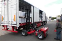 In seinem kompakten Parkplatz unter dem Rahmen des Sattelaufliegers diebstahlsicher untergebracht, versperrt der flinke PALFINGER Crayler Mitnahmestapler überdies nicht den Rampenzugang zur Heckportaltür. Weil neben der Palettenware aber weiterhin auch Teppichrollen transportiert werden, wurde vom belgischen PALFINGER-Partner VD Service ein Teppichrollendorn entwickeln. Je nach Bedarf wird der stählerne Teppich-Spieß mit einem Schnellwechselsystem gegen die Gabelzinken ausgetauscht.