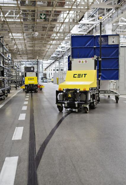Transportwagen direkt an die Regale der Montagelinie liefert. Auch
