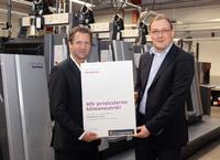 Caption: Presentation of certificate: With Moritz Lehmkuhl (left), Managing Director of ClimatePartner, Martin Betz, Technical Operations Manager of Onlineprinters GmbH, has found the right partner for expanding the climate protection commitment of the online print shop and offering climate neutral print products to customers all over Europe.