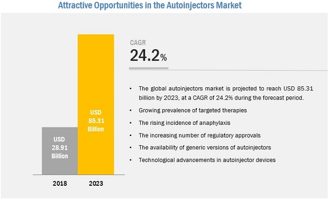 (firmenpresse) - According to the new market research report “Autoinjectors Market by Therapy (Rheumatoid Arthritis, Multiple Sclerosis, Anaphylaxis, Cardiovascular diseases, Psoriasis, Migraine), Type (Disposable, and Reusable), End Users (Homecare, and Hospitals) - Global Forecast to 2023", published by MarketsandMarkets™, The global autoinjectors market is projected to reach USD 85.31 billion by 2023 from an estimated USD 28.91 billion in 2018, at a CAGR of 24.2% during the forecast period (2018-2023). The key factors driving the growth of this market include the growing prevalence of targeted therapies such as rheumatoid arthritis and multiple sclerosis, rising incidence of anaphylaxis, and increasing number of regulatory approvals.