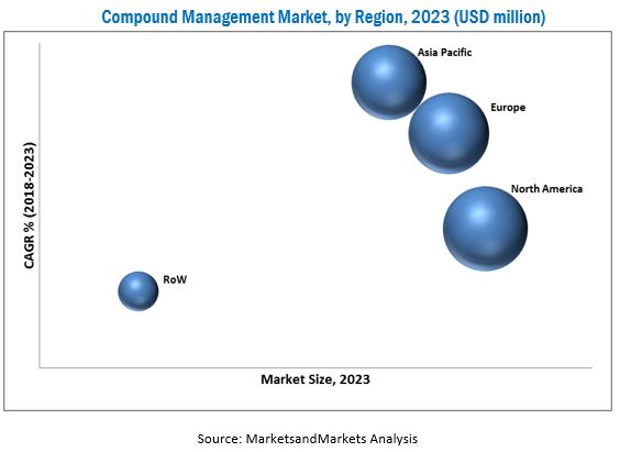 The global compound management market is projected to reach USD 424.5 million in 2023 from USD 215.3 million in 2018, at CAGR of 14.5%. Increasing drug discovery activities, growing biopharmaceutical industry, and rising trend in outsourcing compound/sample management are the factors supporting the growth of this market. On the other hand, the large capital investments needed to establish compound management facilities is the major factor limiting market growth.
