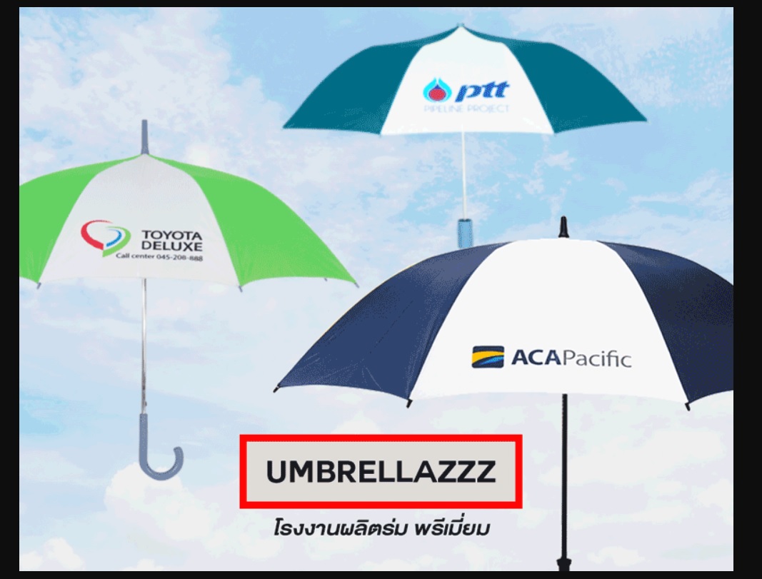Umbrellazzz umbrella factory produces all types of umbrellas, complete set, beautiful logo, exact umbrella, umbrella factory Umbrella service, single umbrella, folding umbrella, golf umbrella, field umbrella, wholesale price, umbrella factory We are an umbrella service provider. and produce umbrellas according to the designs that customers want Or wholesale umbrellas ready to sell at cheap prices, one-part umbrellas, two-part umbrellas, three-part umbrellas, golf umbrellas, black umbrellas.