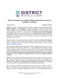 (PresseBox) - District Metals Corp. (TSX-V: DMX) (OTCQB: DMXCF) (FRA: DFPP); (“District” or the “Company”) is pleased to highlight a press release issued by the Swedish Ministry for Climate and the Environment on February 23, 2024, which states that a rapid investigation will commence with the purpose “to remove a ban (on uranium mining) that is not needed.” The press release further states that an “Inquiry Chair will now be tasked with investigating what regulatory changes are needed to enable and clarify the conditions for uranium extraction.” The full press release can be found here, and readers are encouraged to read the announcement in its entirety.