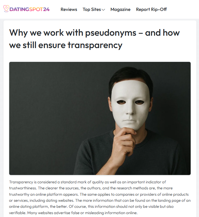 What may seem simple and quick to explain often turns out to be a truly monumental task. Authors must analyze and evaluate all aspects of an online platform and formulate a personal recommendation based on their overall findings. Through structured and clear analyses, DatingSpot24 promotes transparency beyond what individual dating sites may disclose. The next section clarifies that anonymity can coexist with transparency without contradiction and why DatingSpot24 uses pseudonyms for their reviewers.