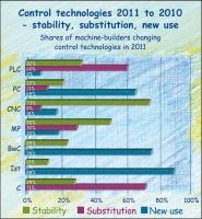 Two control technologies keep stable in the change this year, remaining in use only slightly changed (green bars). These are the CNC and the microprocessor control (MP), which is frequently an in-house solution.