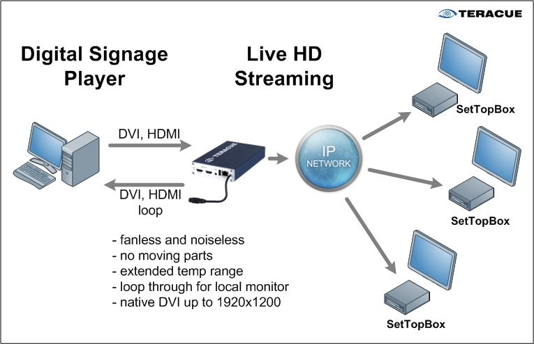 In the Digital Signage sector, the output of a Digital Signage PC player is captured with the ENC-300 encoder. Advertising and infotainment content can then be transmitted to hundreds of television sets or to PC users. A typical example is its use in hotel casinos. Selected digital signage content from the casino can be provided as additional television channels in hotel rooms via the IPTV system. The playback of the HD signage content is possible on cost-effective standard IPTV set-top boxes, such as the Amino 140 series. An individual video data stream can be sent to as many end devices as required, by using multicast stream transmission.